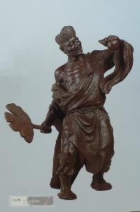 毛关福在【遗珠阁】所塑造的人物形象中,都已成为经典。题材涉及面非常广泛。因为他遇到的搭档,是几位都是只想艺术、不懂经济的另类市场经济弄潮儿,尤其不谙人情世故,对市场运作也是擀面杖吹火——一窍不通!而毛关福思路敏捷,一说就知,一点就通,再难的名题,他总能找到好几个创作方案。譬如“黑旋风李逵”,先是塑了个手持双斧,统体扎札实实肌肉,光着身子,宽带破裤,昂首阔步,直闯敌阵。是一个充满动态,草莽气慨实足的好汉形象。后来一想,在“梁山”生死关头,他挺身而出反对招安,是响当当坚持革命到底的“左派”,於是又创作了一尊“李逵撕诏”,也是这位绿林莽汉子,将朝庭的诏书一撕为二,大开大合,又是佳作一件。在创作卅六将时,又塑了尊站立着的“行者武松”,【遗珠阁】老董亲自为他摆姿势、作模特,完全符合盖叫天老先生《粉墨春秋》中所谈及的各项站立姿势要素,在剧场每个角落,都将站在舞台中央的武松看得清清楚楚,仿佛就冲着你当面站着。可以说“不动犹动”,活了!