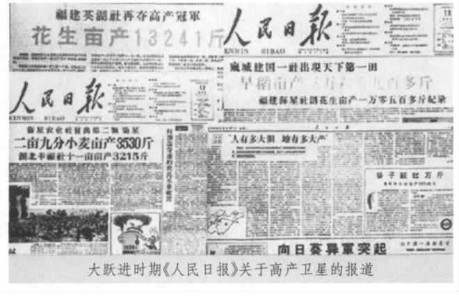 看看这一时期《人民日报》的报道吧,多么振奋人心啊!《小麦低产区树起红旗,郓城县宜路乡出现了3540 斤高产纪录》(1958年6月17日二版),《广东穷山出奇迹:一亩中稻六万斤》(1958年9月5日一版)。湖北省麻城县麻溪河乡和福建省南安县胜利乡的上报早稻亩产达到了36900多斤、花生亩产达到1万多斤时,1958年8月13日《人民日报》以《祝早稻花生双星高照》为题,欢呼:“这又一次生动地证明,‘人有多大胆,地有多大产’,解放了的人民可以创造出史无前例的事迹来”。河南西平县小麦亩产7320斤、四川郫县、广西环江县中稻亩产分别高达82525斤和130434斤的卫星也是通过《人民日报》的报道而家喻户晓的。1958年7月23日《人民日报》社论《今年夏季的大丰收说明了什么》宣布,我国小麦总产量已经超过美国而居世界第二位。“只要我们需要,要生产多少就可以生产出多少粮食来 ”。“一切以农业产量只能以百分之几的速度而不能按百分之几十的速度增长的悲观论调已经完全破产了。”