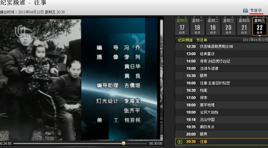 (进入后,先点击“节目单”,再点击日期(4-22),最后点击“20:30 往事)