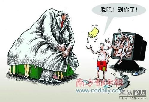 一幅时事漫画近日走红网络,一再被网民高高顶起。这幅名为《脱吧!到你了!》的漫画被4000多个网站转载,其中凯迪的帖子9天时间里点击超过78万,回帖已经过千页,顶帖1.6万人次。