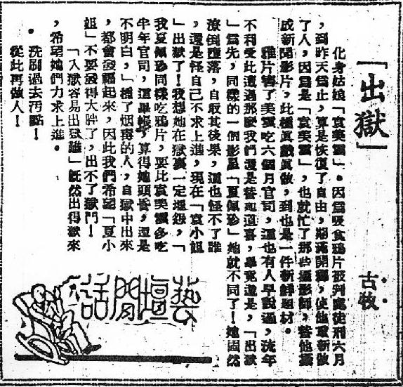 鸦片害了美云吃六个月官司,这也有人早说过,流年不利受此遭遇那么我们还是替她道喜,毕竟还是,[出狱为先],同样的一个影星 [夏佩珍] 她就不同了!她固然潦倒堕落,自取其后果,这也怪不了谁,还是怪自己不求上进,现在 [袁小姐] 出狱了!我想她在狱里一定埋怨,[ 我夏佩珍同样吃鸦片,要比袁美云多吃半年官司,这笔账,算得她头昏,还是不明白],种了烟毒的人,自狱中出来,都会发福起来,因此我们希望 [夏小姐]不要发得太胖了,出不了狱门!